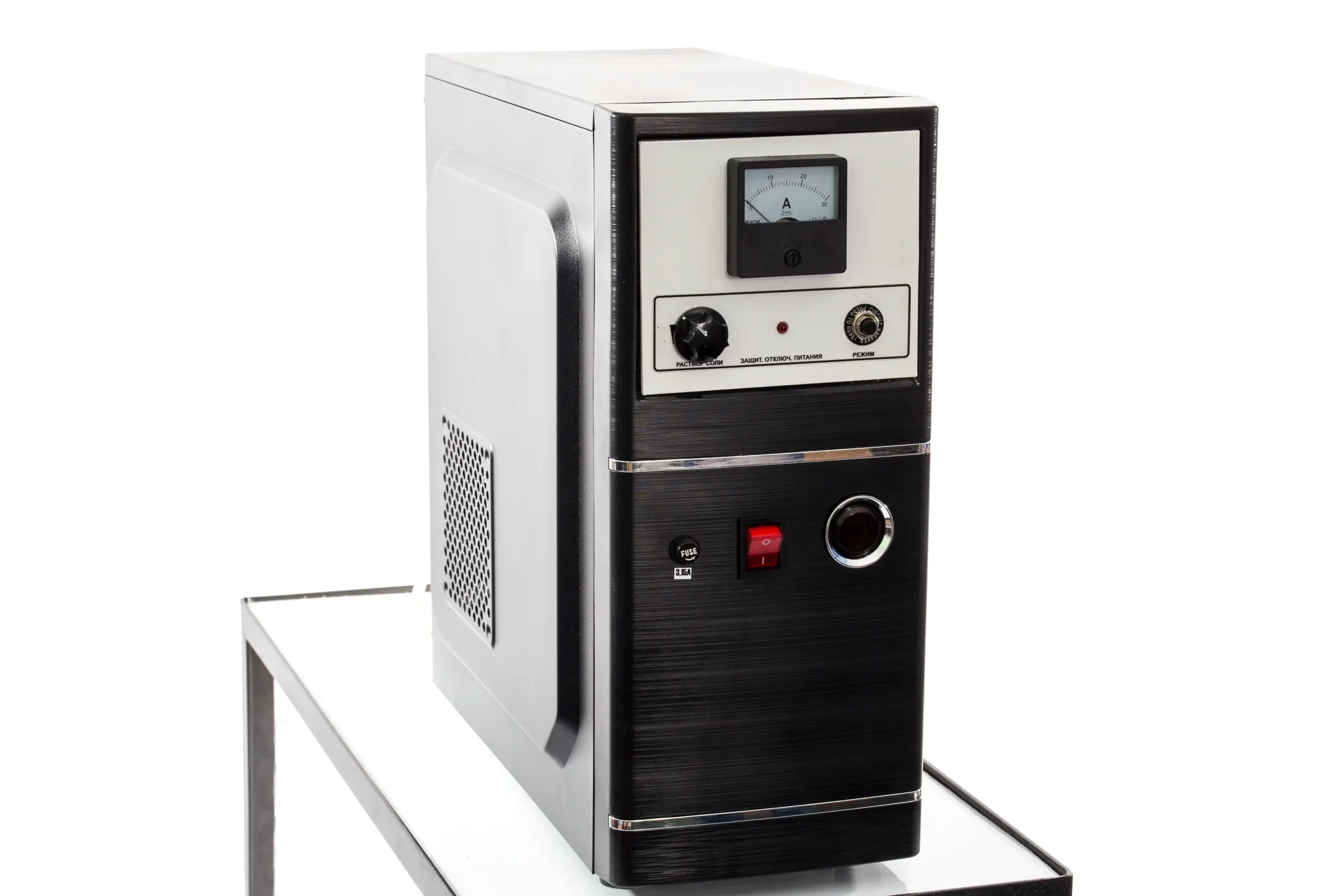 Синтез растворов происходит путем воздействия на малоконцентрированный солевой раствор электрическим полем высокой напряженности. Установка работает в проточном режиме. Т.е. электрохимический синтез растворов осуществляется непрерывно из протекающей через электрохимический реактор установки водопроводной воды смешанной с солевым раствором.